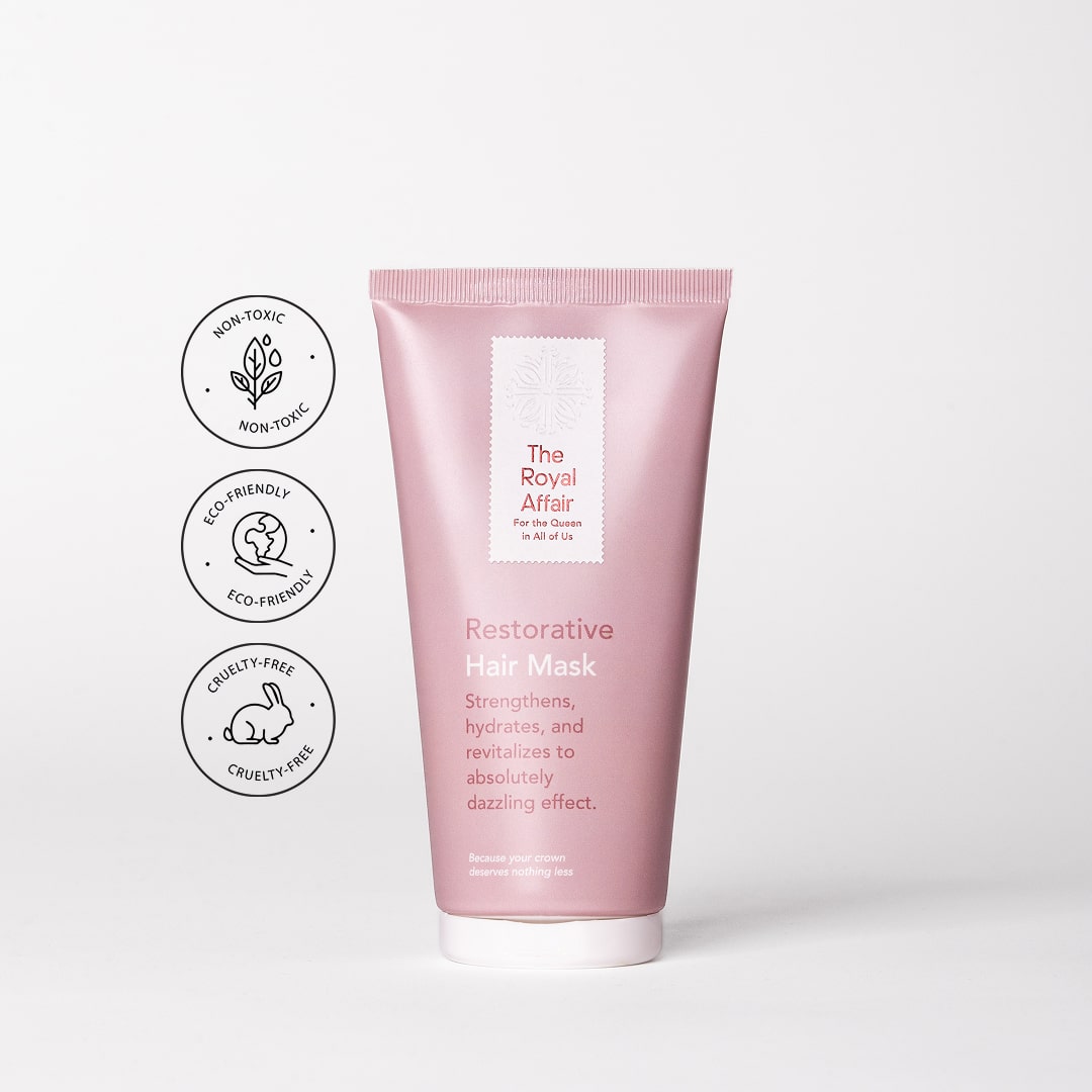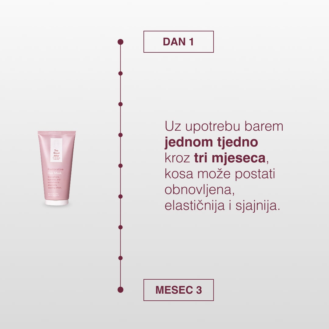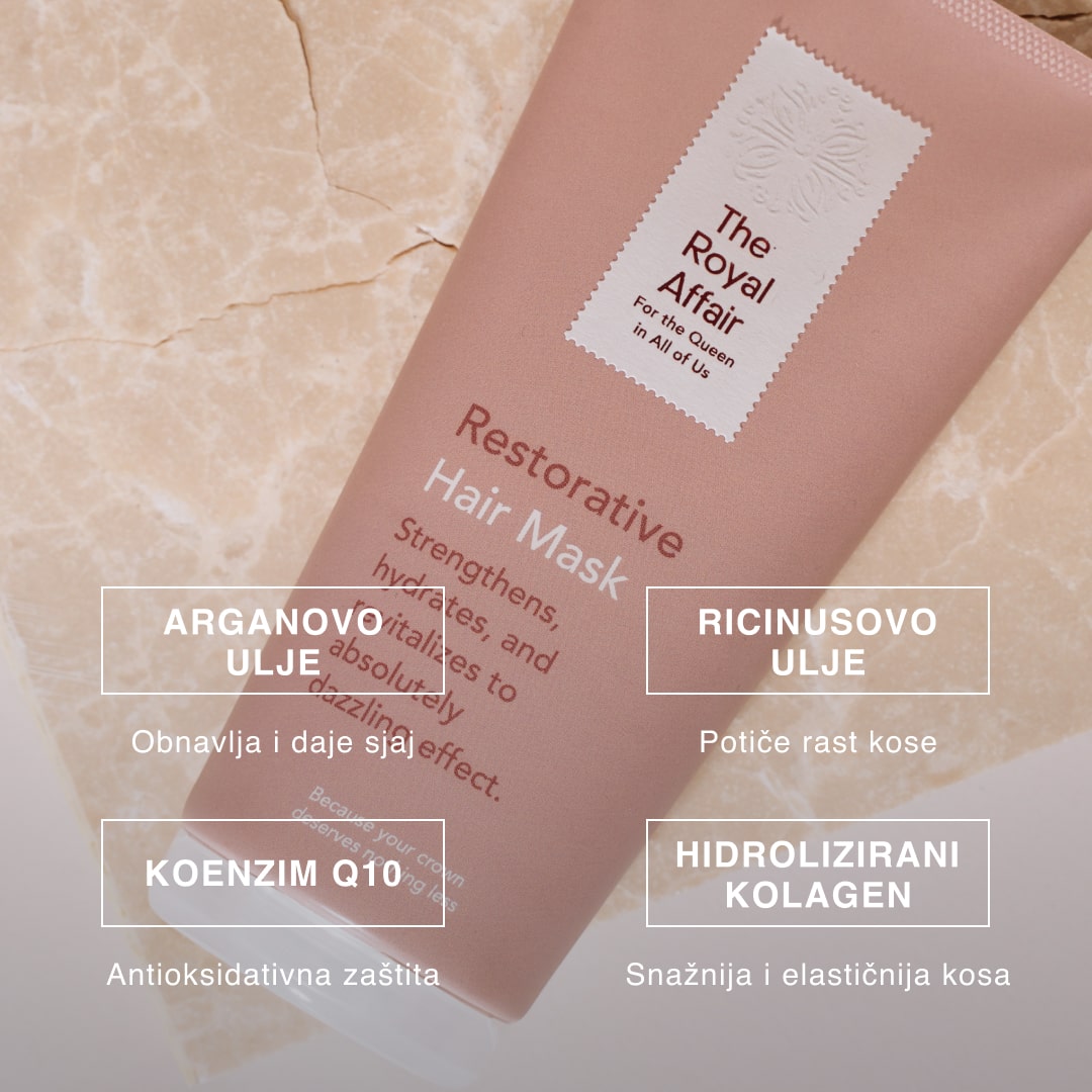 U The Royal Affair koristimo čiste sastojke koji ne sadrže štetne sastojke. Naša obnavljajuća maska ne sadrži SLES (natrijev lauril sulfat) i SLS (natrijev dodecilsulfat), parabene, mineralna ulja, teške kemikalije i druge nepoželjne tvari. Osiguravamo kvalitetnu njegu koja je nježna prema vašoj kosi i prema prirodi.